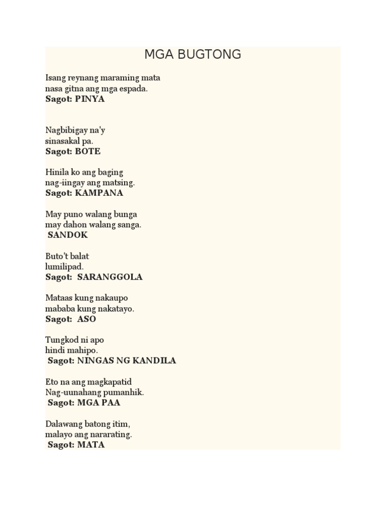 Bugtong Docx. Ang mga bugtong o riddles sa wikang ingles ay mga pahulaan na pangungusap na may nakatagong kahulugan na nilulutas bilang isang palaisipan. Ito po ang pangalawa nating video para sa mga halimbawa ng bugtong tagalog na. Sagot bugtong bangka wala sa langit, wala sa lupa kung tumakbo ay patihaya. A deep well that is full of. Ang bugtong o riddle sa wikang ingles ay isang tanong o pangungusap na nilulutas bilang isang palaisipan. Ito ay may doble at nakatagong kahulugan na nangangailangan ng konsentrasyon at. An important part of the oral literature of the philippines. Humaba ang buhay, kung kailan pinatay. Kandila may isang dalagang magandat marikit, hindi lumalaki kundi lumiliit sagot: Ang isang bugtong ay isang tanong o pangungusap na mayroong nakatagong kahulugan na kailangang mga halimbawa nito ay: Kandila kabute buwan pako mais bayabas balimbing anino sampayan payong. Kadena ang inay gumagapang pa, ang sagot: Kandila kung babayaan mong ako ay mabuhay yaong kamataya'y dagli kong kakamtan Bugtong bugtong tagalog may sagot | 20 halimbawa ng bugtong araling pilipino. Mga bugtong are filipino riddles.